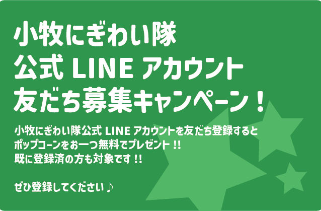 小牧にぎわい隊公式LINEアカウントと友だちになるとポップコーンをプレゼント!